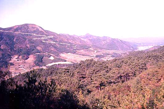 | 海見山(標高870.0m)は,広島市街地の北方約25kmにある山で,その東麓にはペディメント(山麓緩斜面)が発達している。 海見山を主峰とする海見山山塊は,北東−南西方向に延び,山頂付近はやや小起伏であるが,山腹斜面は急峻である。しかし,標高500m付近から谷底にかけては,谷の発達のあまり見られない緩やかな斜面へと漸移している。この山麓の緩やかな斜面がペディメント(山麓緩斜面)である。 海見山は,日本海側の水系(江の川)と瀬戸内海側の水系(太田川)の分水界に当たり,ペディメントのほとんどは,日本海側の流域に分布するため,傾斜変換線から谷底面までの比高は100数十m程である。山頂部から急斜面までは流紋岩分布域,山麓緩斜面は花崗岩が分布しており,地質と地形の境界がほぼ一致する。 このような,地形的・地質的類似性をもった斜面は,海見山の西に続く,城山(標高667.0m),野々志山(標高741.0m),龍頭山(標高928.4m)山塊の山麓一帯に広く見られる。 |