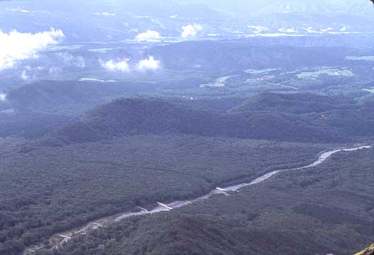 | 大山南壁の崩壊地の一部。二ノ沢源頭は弥山−剣ヶ峯間の稜線直下にあり,激しい崩壊を起こしている。崩落物は二ノ沢に集積し,谷を埋めてしまったため,水は伏流となっている。谷を埋積している土砂は降水や雪解け時に下方へズルズルと滑り落ちている。土砂は大山環状道路を横切り,福永原の南を南西に流れ,白水川(しろみがわ)となる。大山環状道路から3kmほど下流,標高550m付近から地表水が現われる。二ノ沢には数多くの砂防堰に加え,一部の河岸には堤防も設置されている。かつては大量の土砂が日野川下流へ運ばれ,夜見半島の砂州の形成に大きな役割を果たした。 | ||||||